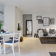 這套案例很有北歐瑞典風情,全屋選用白色為主色調(diào),讓空間增加寬敞感。家具幾乎全部為黑白(灰)搭配,對比效果明顯。家具造型簡單,突出硬朗的線條,給人干凈利落的感覺,突出主人時尚的生活品味。白色給人潔凈明朗的感覺,同時還能增強空間感??蛷d配備了充足的燈飾,采光條件極好。簡單的沙發(fā),特色小茶幾,組合黑白相框,讓客廳充滿時尚個性。