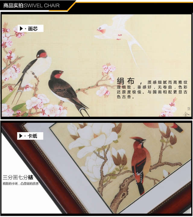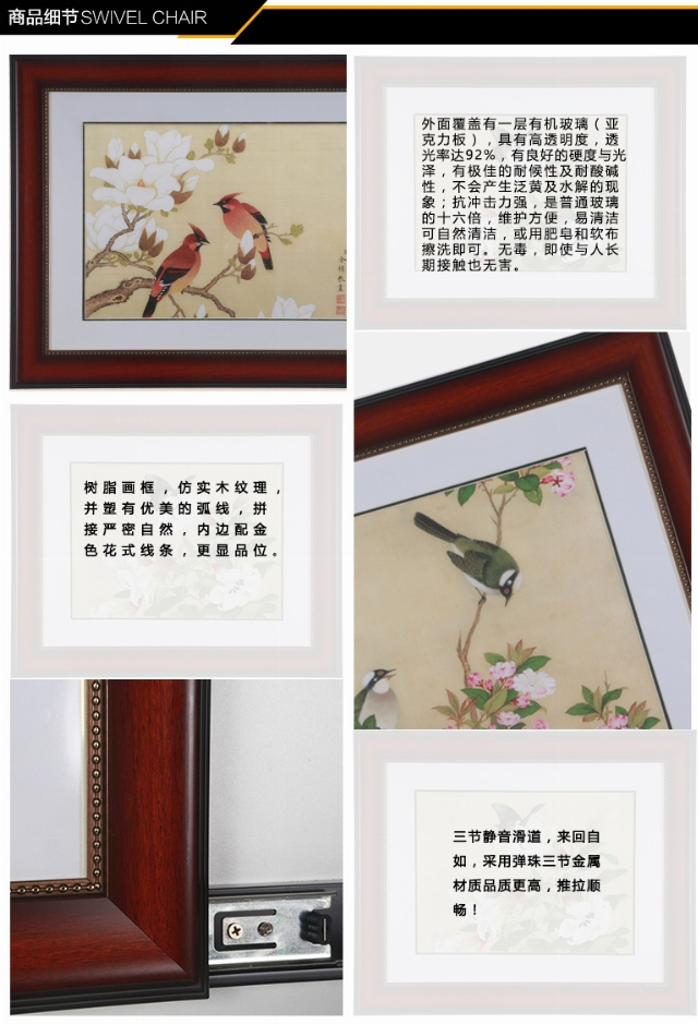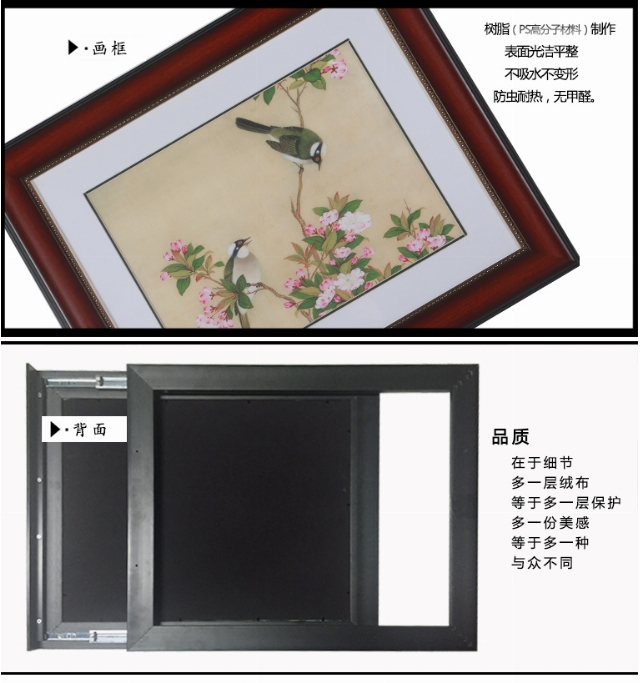 樹脂畫框,仿實(shí)木紋理,并塑有優(yōu)美的弧線,拼接嚴(yán)密自然,內(nèi)邊配金色花式線條,更顯品位。
