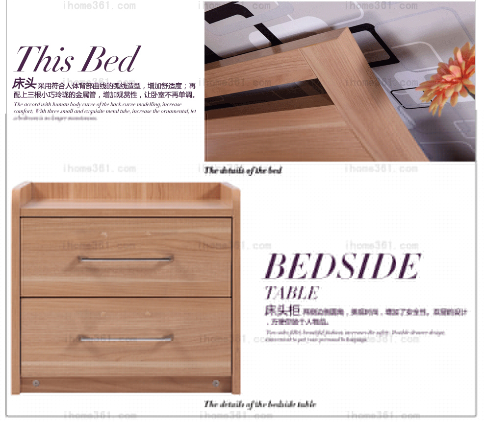 | 細(xì)節(jié)描述 | 床頭上配有三根小巧玲瓏的金屬管,增加觀賞性。床體內(nèi)有液壓桿支撐,方便取存物品,床體后部的設(shè)計類似盒子,有兩塊蓋板,可以直接用手提起來 。 |