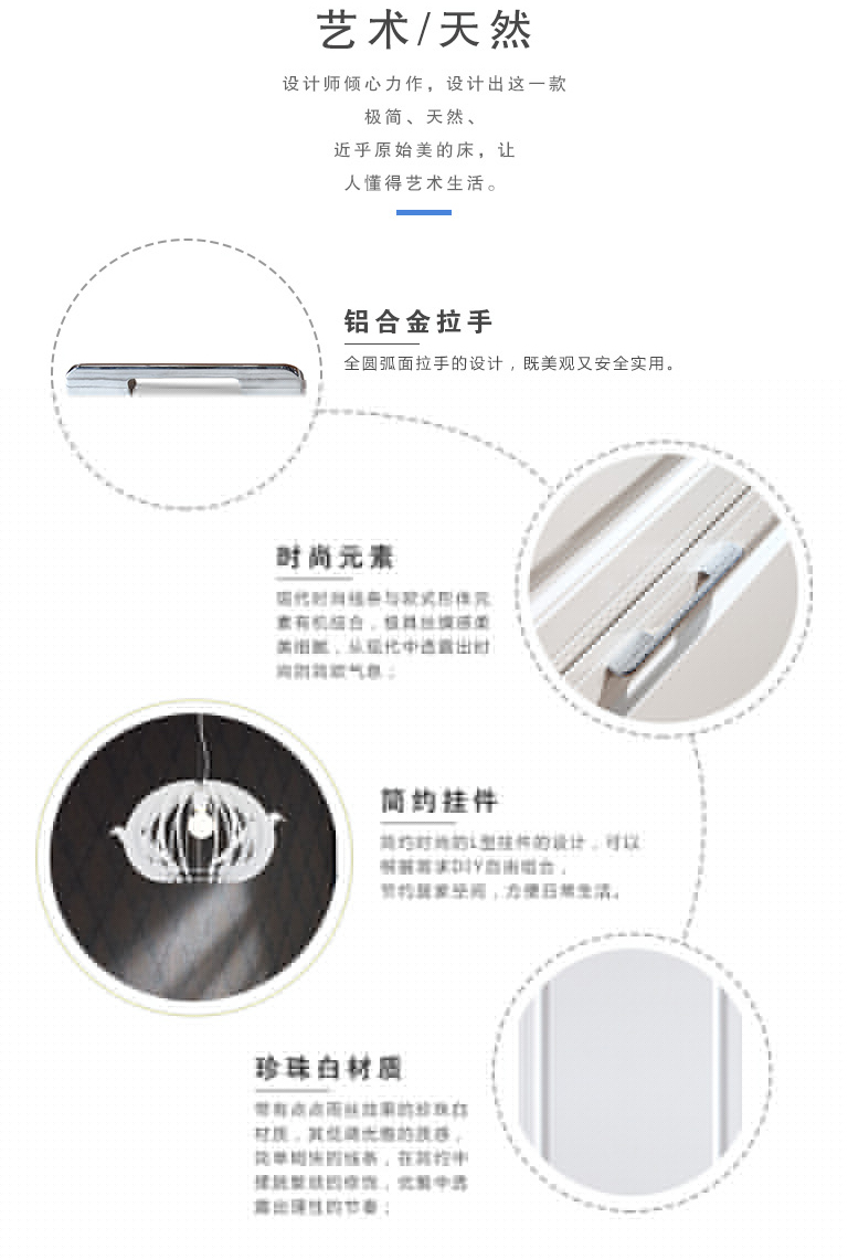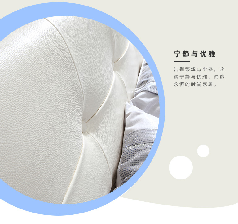 | 細(xì)節(jié)描述 | 家具在簡約中擺脫了繁瑣的修飾,從此,時尚的大潮中多了一朵潔白如玉的浪花;生活在簡約中除卻了人世的紛擾,從此,指縫間流過的時間都閃放著珍珠般細(xì)致的光芒。 |