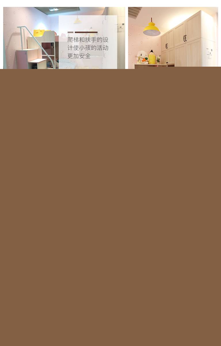 | 細節(jié)描述 | 雙層兒童床可以容納兩個小朋友,增加了孩子的趣味性和互動性,北美雪松與粉色的搭配,溫馨又舒適。爬梯和扶手的設(shè)計使小孩的活動更加安全。衣柜和開放格的結(jié)合把每個空間都利用好,不僅可以擺放玩具,又可以很好的放置衣物。 |