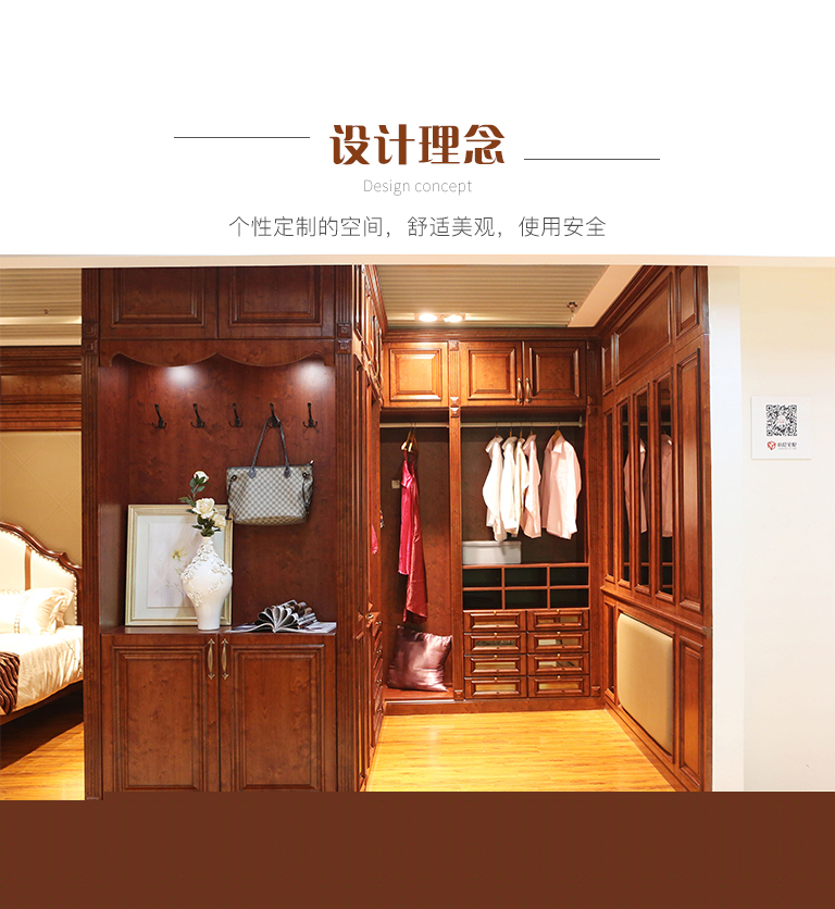 | 細節(jié)描述 | 衣帽間確保沒有一處空間浪費,同時也給衣物最適合的收納方式。衣柜內(nèi)加入了格架和抽屜專門用來收納小的物品,可推拉的儲物衣柜讓空間利用更加合理,軟包護墻板和鏡子,舒適美觀,使用安全 ,使整體空間裝飾效果明顯,方便保養(yǎng)維護。漫步其中,每一寸空間都擁有無論倫比的精致與奢華。 |