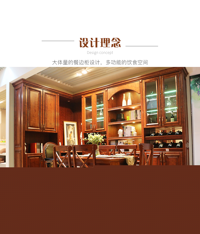 | 細(xì)節(jié)描述 | 餐廳餐邊柜需要大體量多功能。餐邊柜內(nèi)部格局的設(shè)計(jì)合理,敞開式的層板上和玻璃門板可以擺放書、畫冊、裝飾品以及漂亮的餐具,在柜體的部分空間加裝柜門,里面可以存放餐巾布、食物等比較瑣碎的物品。還有收納功能儲物柜,可以供放置碗碟筷、酒類、飲料類,以及臨時(shí)放湯和菜肴用,也可放置客人包小物件,酒插格放置美酒,每一次吃飯都是享受。 |