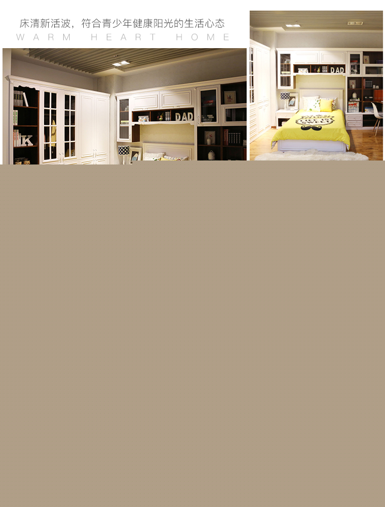 | 規(guī)格 | 兒童床:1325*1200*2071mm 床頭柜:580*450*505mm 衣柜(定制) 轉(zhuǎn)角書桌(定制) 書柜(定制) 卡座(定制) |