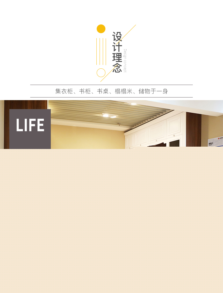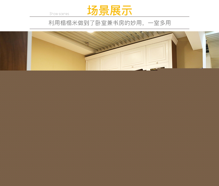 | 細(xì)節(jié)描述 | 這個(gè)房間功能十分強(qiáng)大,利用榻榻米做到了臥室兼書房的妙用,一室多用。柜體到頂不但美觀而且實(shí)用,兩側(cè)的書柜完美的區(qū)分休閑區(qū)和學(xué)習(xí)區(qū),書桌和榻榻米連為一體,小空間大利用。 |