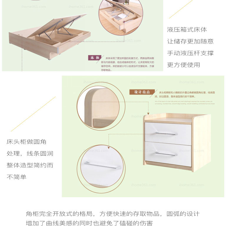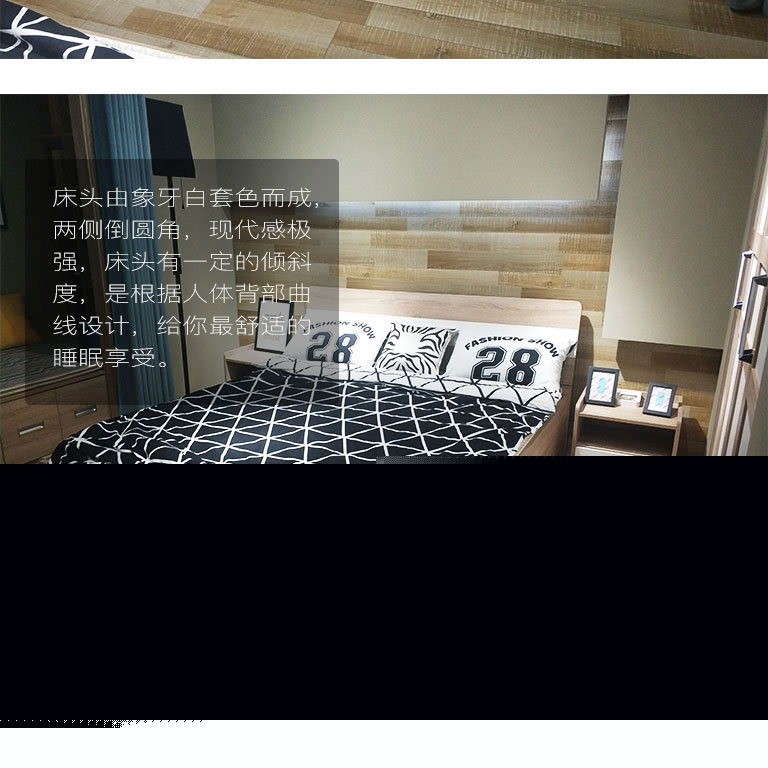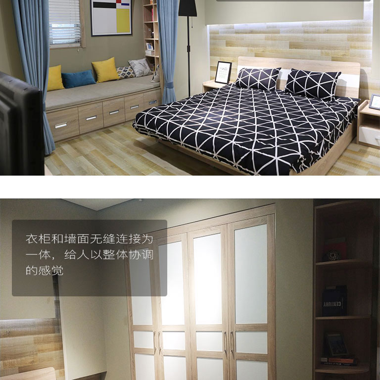 | 規(guī)格 | 床頭:1570*115*927mm 床體:2037*1562*401mm 床頭柜:498*400*450mm 對(duì)開門衣柜:900*580*2300mm 角柜:400*600*2300mm 床墊:1800*2000*100mm |