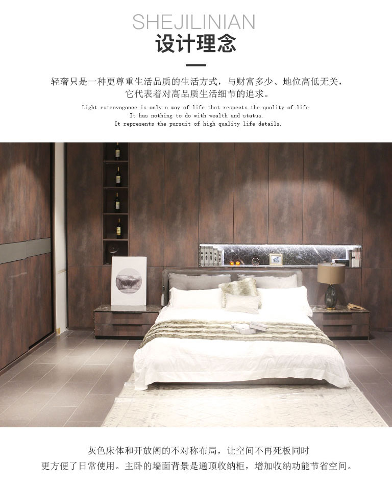 | 產(chǎn)品特點(diǎn) | 輕奢,是指一種倡導(dǎo)"輕奢華新時(shí)尚"的生活理念。輕奢只是一種更尊重生活品質(zhì)的生活方式,與財(cái)富多少、地位高低無關(guān),它代表著對(duì)高品質(zhì)生活細(xì)節(jié)的追求。布魯斯系列,以自己的態(tài)度和個(gè)性詮釋生活的樣貌,給予居住者身心輕盈的舒適享受,他是無負(fù)擔(dān)的、高品質(zhì)的寧靜生活空間。簡而不凡、潮而不俗、奢而不露,注重每個(gè)細(xì)節(jié),將個(gè)性魅力與奢華品質(zhì)融入細(xì)節(jié)中,以剛剛好的姿態(tài),融入我們的生活。 |