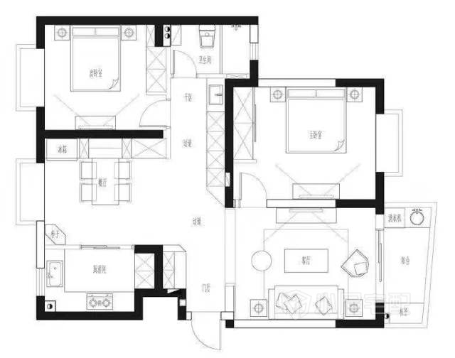 整個空間在色系上選擇灰藍(lán)色與白色作為背景色,棕與會為主體,藍(lán)黃作為輔助,適當(dāng)?shù)慕鹕约狱c綴,定格為簡約北歐風(fēng)